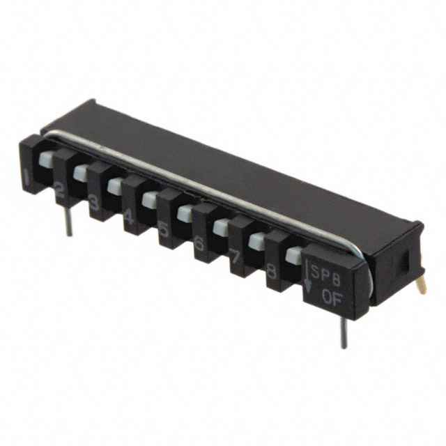 Descripción detallada Dip Switch SPST 8 Position Through Hole, Right Angle Slide (Standard) Actuator 10mA 20VDC Valoración actual 10mA