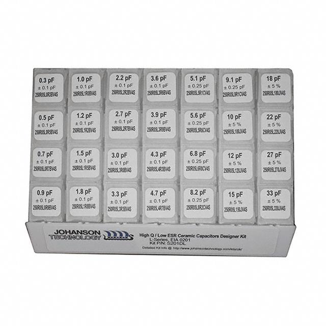 Caracteristicas High Q, Low Loss Descripción detallada Ceramic Capacitor Kit 0.3pF ~ 33pF 25V Surface Mount, MLCC 560 Pieces (28 Values - 20 Each)